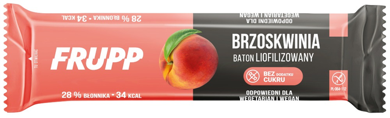 Baton FRUPP brzoskwinia stworzyliśmy z myślą o najmłodszych konsumentach. Po prostu pyszna, owocowa przekąska dla dzieci! Nie ma dodatku tłuszczu i soli! Bez dodatku cukru. Zawiera naturalnie występujące cukry.