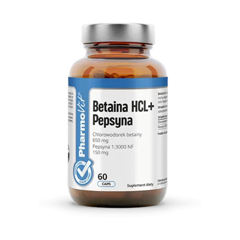 Betaina HCl - betaina to aminokwas, znany również jako trimetyloglicyna. To organiczny związek chemiczny, który częściowo jest syntetyzowany w ludzkim organizmie. Pepsyna to enzym trawienny, który odpowiada za rozkład białka.