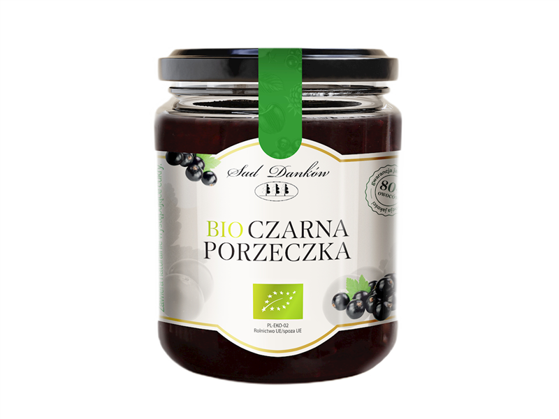 100 g produktu sporządzono z 80 g owoców. Produkt pasteryzowany otrzymany przez odszypułkowanie owoców czarnej porzeczki z dodatkiem koncentratu jabłkowego w celu otrzymania odpowiedniego poziomu pH.