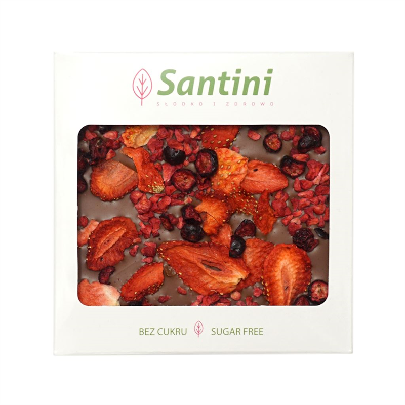 CZEKOLADA MLECZNA Z MALINĄ, TRUSKAWKĄ I PORZECZKĄ BEZ DODATKU CUKRU BEGLUTENOWA 80 g - SANTINI (PRODUKT SEZONOWY)