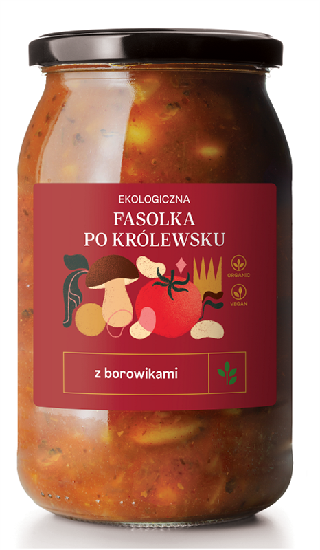 fasola Jaś*, borowiki szlachetne* 5%, pomidory*, papryka wędzona*, olej*, sól, pieprz*, majeranek*, woda (* certyfikowany składnik ekologiczny)