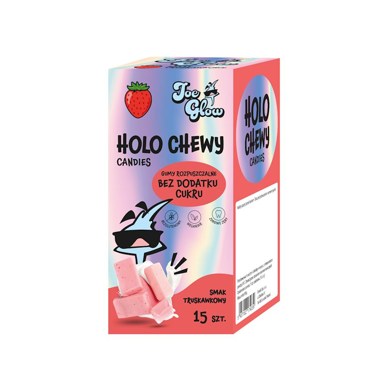 Holo Chewy gumy rozpuszczalne bez dodatku cukru o smaku truskawkowym. Zawierają substancje słodzące. Produkt bez glutenu. Odpowiedni dla wegan. Spożywanie żywności zawierającej maltitol i izomalt zamiast cukru pomaga w zachowaniu mineralizacji zębów. Produkt przeznaczony dla dzieci powyżej 3 roku życia.