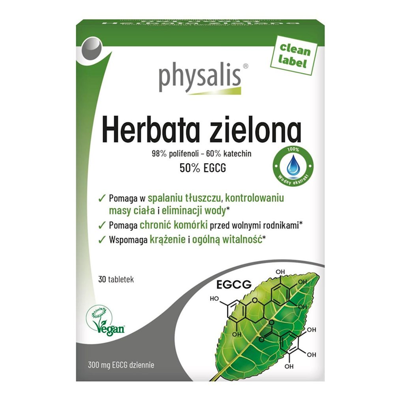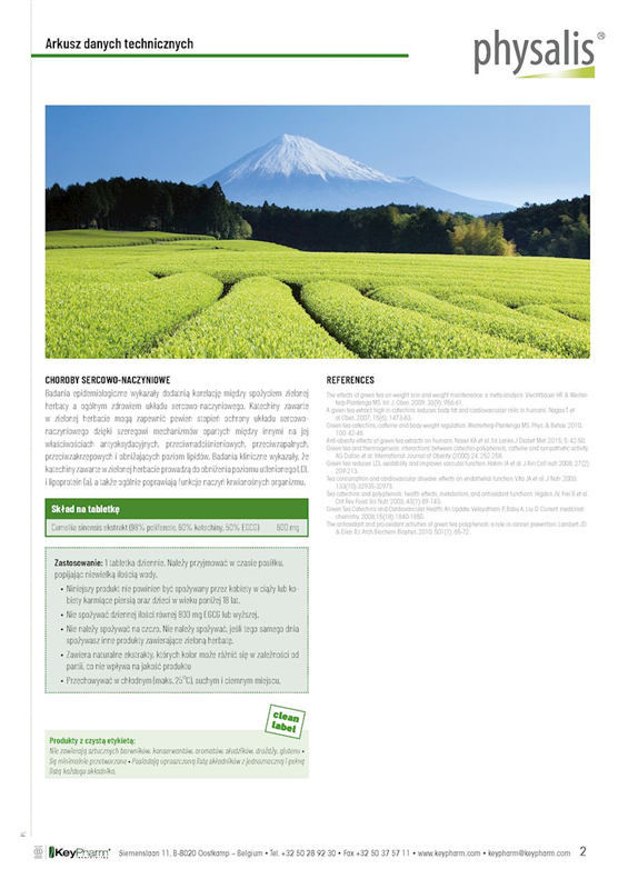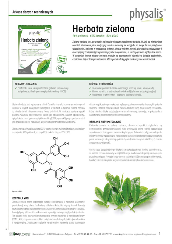 Physalis Green Tea zawiera wodny ekstrakt z zielonej herbaty z nie mniej niż 98 % polifenoli i 60 % katechin, z czego 50 % to najszerzej badana katechina, mianowicie EGCG lub galusan epigallokatechiny-3.