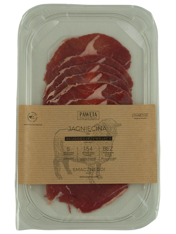 Ze 154 g mięsa wyprodukowano 100 g wędliny dojrzewającej. Bez fosforanów, bez laktozy, bez glutenu.