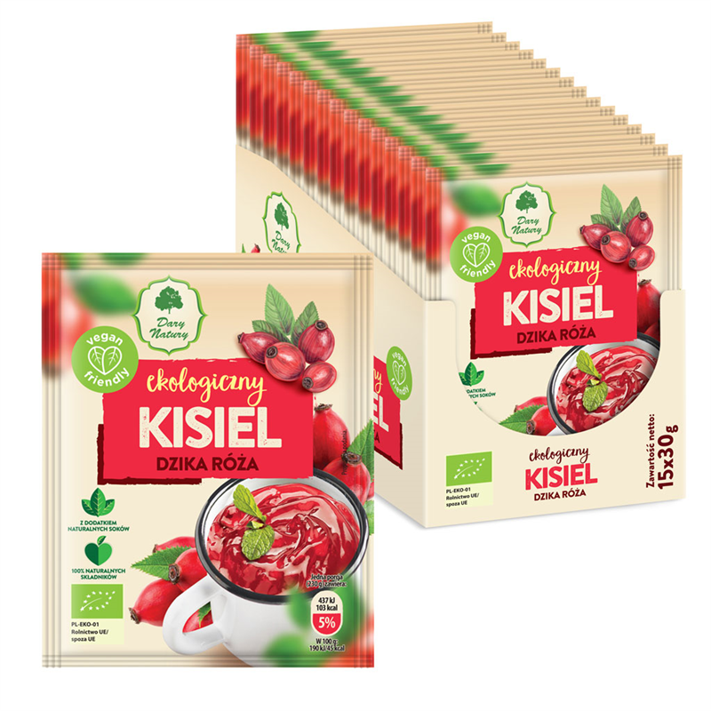 Ekologiczny kisiel dzika róża, z dodatkiem naturalnych soków i w 100 % z naturalnych składników. Pyszna przekąska do szybkiego i łatwego przygotowania w kubku.