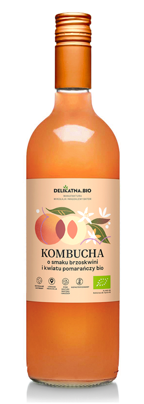KOMBUCHA O SMAKU BRZOSKWINI I KWIATU POMARAŃCZY BIO 750 ml - DELIKATNA (ZAKWASOWNIA)