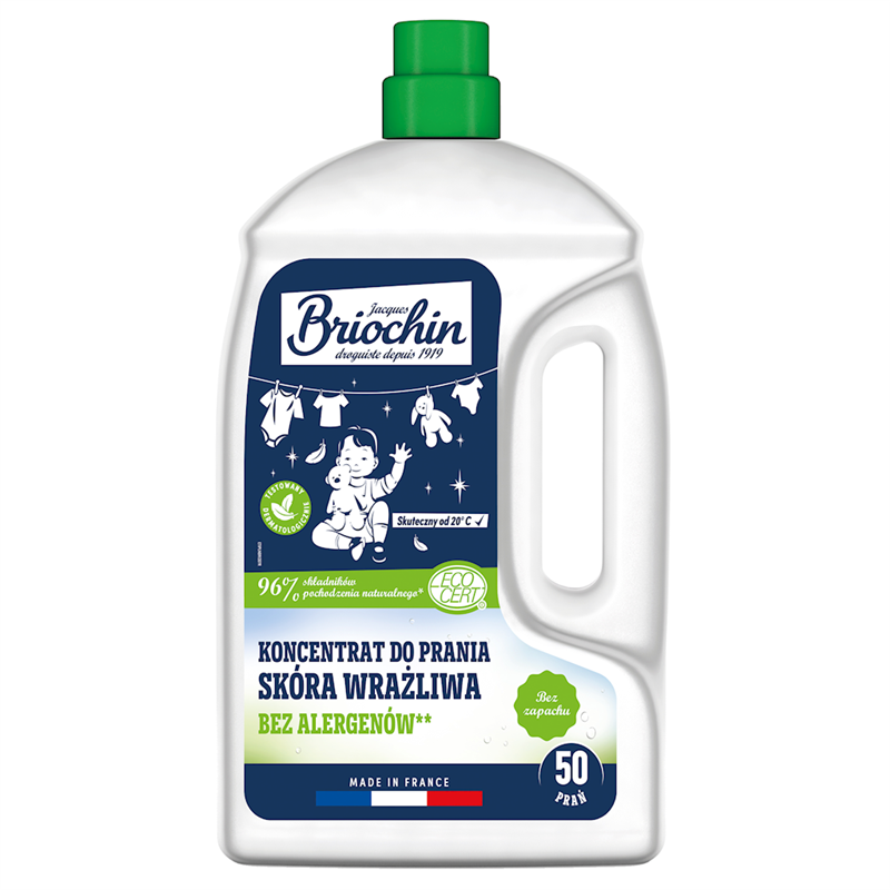 Koncentrat do prania Briochin, stworzony z myślą o skórze wrażliwej, to idealne rozwiązanie do prania ubranek niemowlęcych oraz odzieży dziecięcej, a także odzieży osób z alergiami lub nadwrażliwą skórą. Formuła produktu nie zawiera sztucznych dodatków: barwników, optycznych wybielaczy, alergenów co czyni go bezpiecznym do stosowania w każdym domu, w którym komfort skóry jest priorytetem. Koncentrat wystarcza na 50 prań.