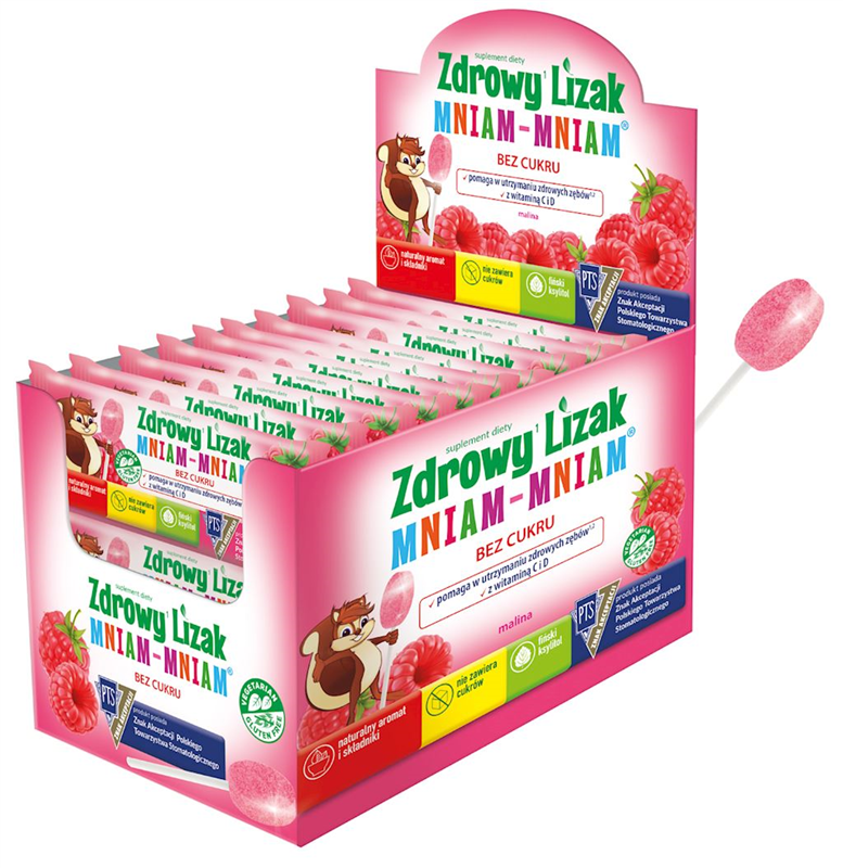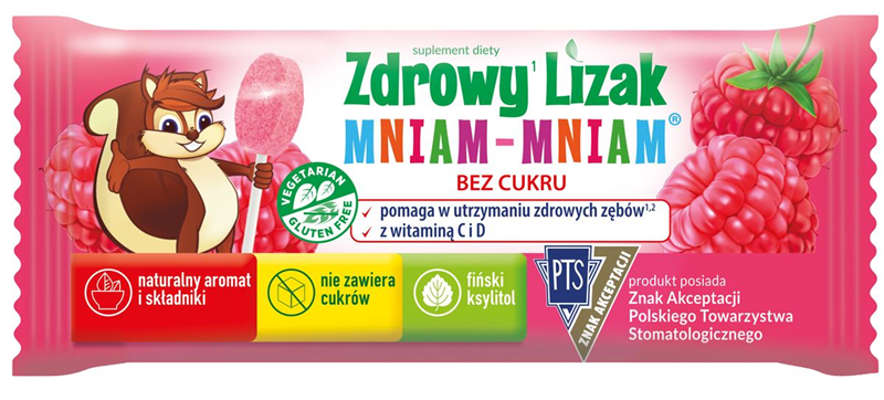 Lizak Mniam-Mniam o smaku malinowym zawiera zawiera substancje słodzące: fiński ksylitol oraz glikozydy stewiolowe. Spożywanie żywności zawierającej ksylitol zamiast cukru pomaga w zachowaniu mineralizacji zębów. Lizak zawiera witaminę D i C, kóre pomagają w prawidlowym funkcjonowaniu układu odpornościowego. Witamina D pomaga w utrzymaniu zdrowych kości, zębów oraz prawidłowym funkcjonowaniu mięśni. Witamina D bierze udział w procesie podziału komórek. Witamina C pomaga w prawidłowej produkcji kolagenu, w celu zapewnienia prawidłowego funkcjonowania kości, chrząstki, dziąseł, skóry i zębów.  Produkt nie zawiera cukrów i substancji konserwujących. Produkt bezglutenowy.