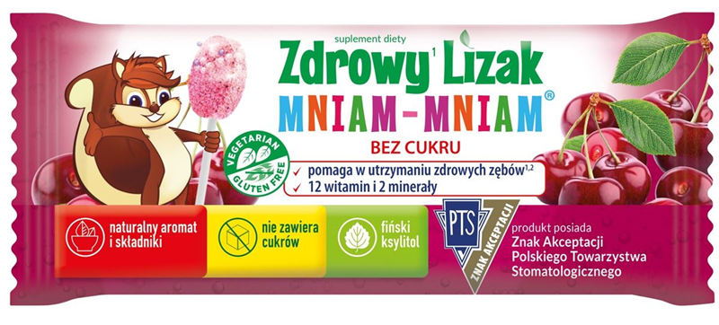 Suplement diety. Lizak Mniam-Mniam o smaku musującej wiśni zawiera substancje słodzące: fiński ksylitol oraz glikozydy stewiolowe. Spożywanie żywności zawierającej ksylitol zamiast cukru pomaga w zachowaniu mineralizacji zębów. Lizak zawiera kompleks 12 witamin i 2 minerały. Witamina A, B6, B12, C, D, selen, cynk i kwas foliowy wspierają układ odpornościowy. Witamina B6 i niacyna przyczyniają się do zmniejszenia uczucia zmęczenia i znużenia oraz wspomagają układ nerwowy. Cynk pomaga w utrzymaniu prawidłowych funkcji poznawczych. Witamina D pomaga w utrzymaniu zdrowych kości, zębów oraz w prawidłowym funkcjonowaniu mięśni. Witamina D bierze udział w procesie podziału komórek. Kwas pantotenowy pomaga w utrzymaniu sprawności umysłowej na prawidłowym poziomie oraz przyczynia się do prawidłowej syntezy i metabolizmu hormonów steroidowych, witaminy D i niektórych neuroprzekaźników.