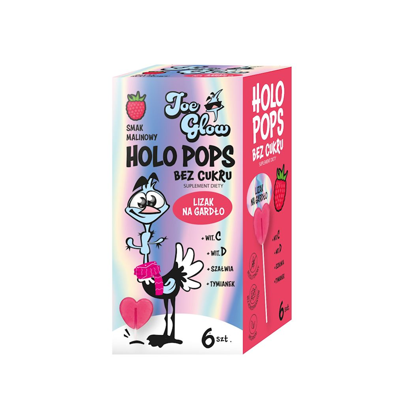 Lizak kryształowy Holo Pops bez cukru o smaku malinowym na gardło.