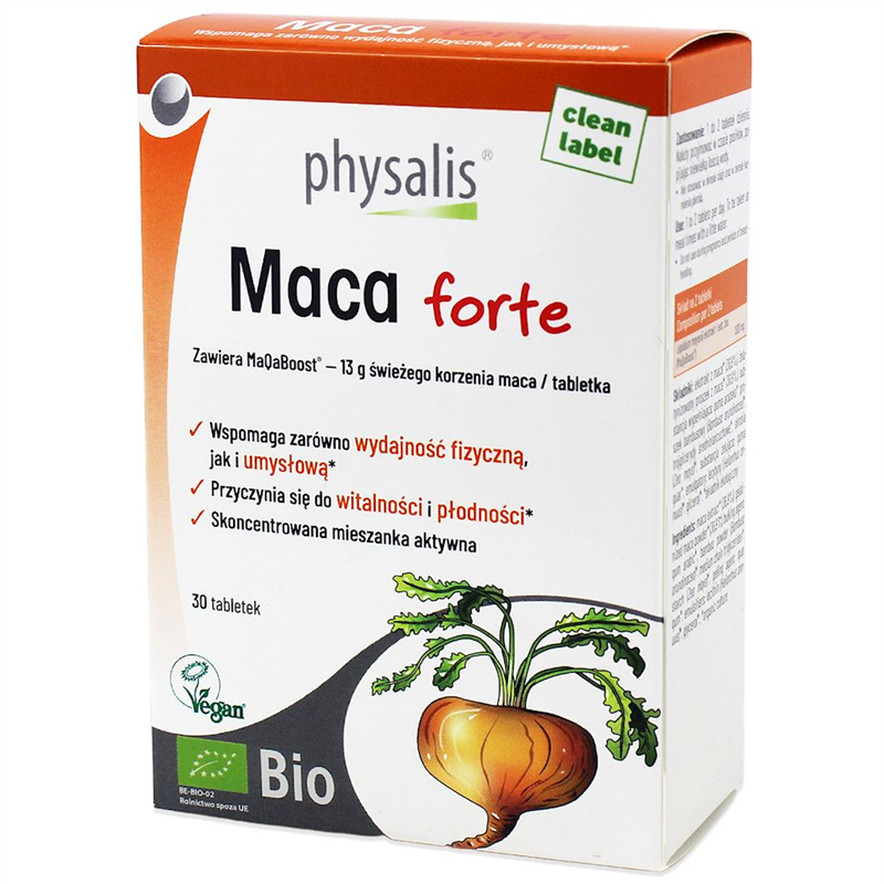 Physalis Maca forte bio zawiera MaQaBoost®, unikalną skoncentrowaną mieszankę ze 100 % organicznymi ekstraktami z maca.