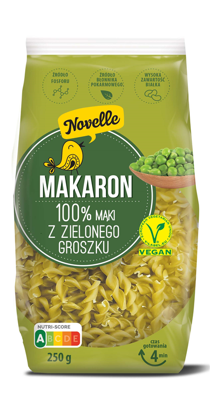 Makaron Novelle z zielonego groszku jest wytwarzany w 100 % z mąki z zielonego groszku. Jest zdrową alternatywą dla tradycyjnych makaronów wytwarzanych z mąki pszennej, jest mniej kaloryczny i dostarcza wielu cennych składników.