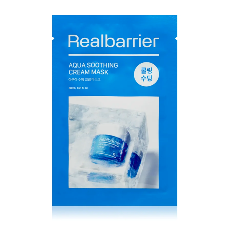 Real Barrier Aqua Soothing Cream Mask, 30 ml, Maseczka w płachcie nasączona kremowo-żelową esencją, obniża temperaturę skóry i przynosi uczucie delikatnego chłodzenia. Dzięki kompleksowi nawilżającemu i ekstraktom roślinnym skóra staje się miękka, gładka i ukojona. Idealna do stosowania w każdej chwili, gdy skóra potrzebuje odświeżenia i wyciszenia.