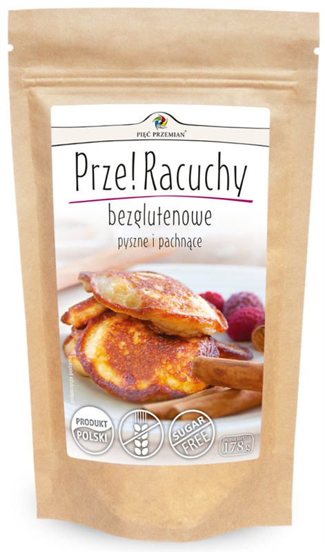 Prze! Racuchy to produkt bez glutenu, cukru, kukurydzy, mąki z białego ryżu i zbędnych ulepszaczy. Nasza mieszanka zawiera tylko 1 g cukrów prostych na 100 g produktu i aż 7,3 g błonnika.