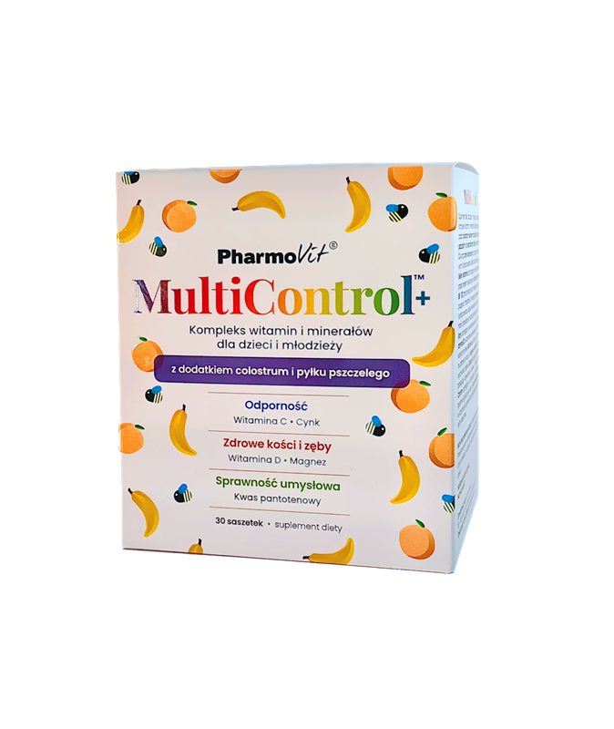 MultiControl™to suplement diety dla dzieci i młodzieży, zawierający kompleks witamin i minerałów. Skład wzbogacony został colostrum wołowym bez laktozy, pyłkiem pszczelim oraz ekstraktami roślinnymi. Witaminy C, A oraz cynk pomagają w prawidłowym funkcjonowaniu układu odpornościowego. Selen, witamina E pomagają w ochronie komórek przed stresem oksydacyjnym. Niacyna, witaminy B6 i B12 przyczyniają się do zmniejszenia uczucia znużenia i zmęczenia. Pomagają w prawidłowym funkcjonowaniu układu nerwowego oraz w utrzymaniu prawidłowych funkcji psychologicznych. Foliany pomagają w prawidłowej produkcji krwi, a witamina B2 w utrzymaniu prawidłowego stanu czerwonych krwinek. Witamina K pomaga w utrzymaniu zdrowych kości, a magnez i witamina D zdrowych kości i zębów. Żelazo pomaga w prawidłowej produkcji czerwonych krwinek i hemoglobiny. Witamina C pomaga w prawidłowej produkcji kolagenu w celu zapewnienia prawidłowego funkcjonowania skóry, kości, chrząstki, dziąseł oraz zębów. Chrom pomaga w utrzymaniu prawidłowego poziomu glukozy we krwi, a kwas pantotenowy w utrzymaniu sprawności umysłowej na prawidłowym poziomie. Produkt zawiera substancje słodzące.