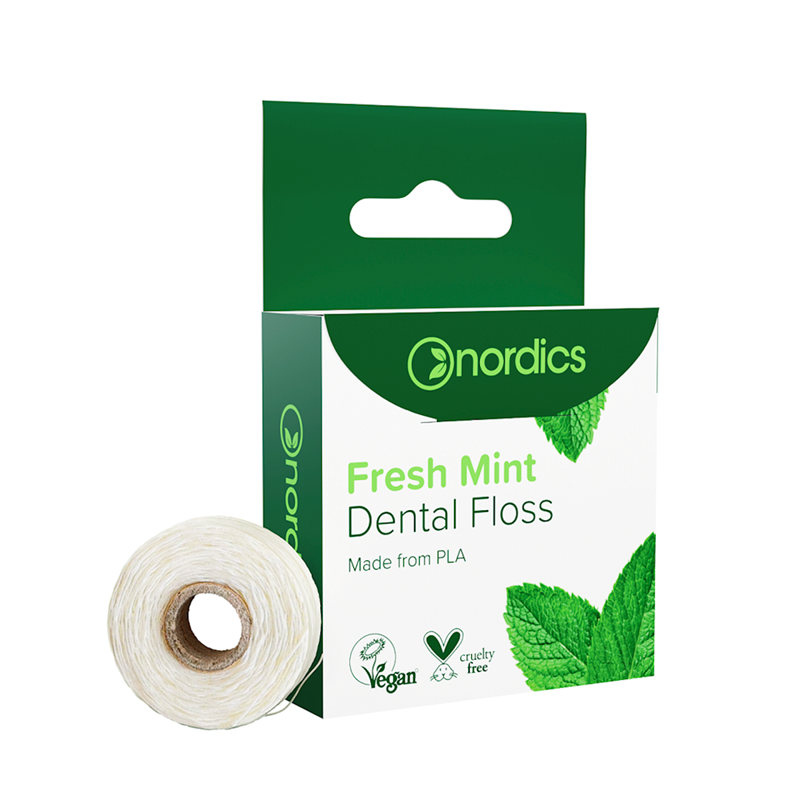 Klasyczna nić dentystyczna z dodatkiem olejku miętowego. Ta miętowa, świeża nić dentystyczna jest wykonana z PLA, jest to specjalny rodzaj trwałego materiału, który można poddać recyklingowi. Nić dodatkowo została pokryta woskiem kandelila, który zapewnia poślizg. Nić pozostawia czystą i świeżą jamę ustną.