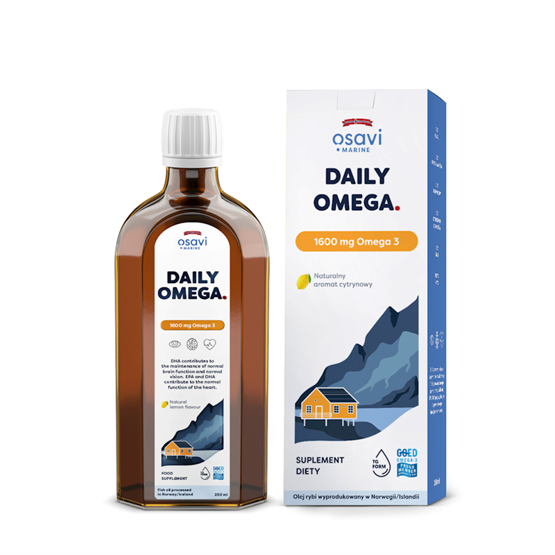 Proponujemy Ci Daily Omega o przyjemnym, naturalnym cytrynowym aromacie, która zapewnia skuteczny sposób uzupełniania kwasów omega-3. Nasz olej RYBNY jest produkowany w Norwegii z dzikich RYB pelagicznych, głównie anchovies, pochodzących ze zrównoważonych połowów. Produkt bogaty jest w niezbędne nienasycone kwasy tłuszczowe EPA i DHA w naturalnej i wysoce przyswajalnej formie trójglicerydów (inaczej zwanej TG), co pozwala uzyskać maksymalne korzyści z ich suplementacji. Jedna łyżeczka dziennie dostarcza 1600 mg kwasów omega-3 w tym min. 700 mg EPA oraz min. 600 mg DHA, co pozwala kompleksowo zadbać o mózg, serce i wzrok.