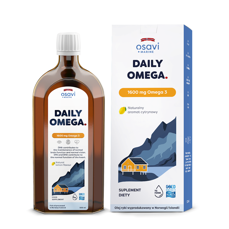 Proponujemy Ci Daily Omega o przyjemnym, naturalnym cytrynowym aromacie, która zapewnia skuteczny sposób uzupełniania kwasów omega-3. Nasz olej RYBNY jest produkowany w Norwegii z dzikich RYB pelagicznych, głównie anchovies, pochodzących ze zrównoważonych połowów. Produkt bogaty jest w niezbędne nienasycone kwasy tłuszczowe EPA i DHA w naturalnej i wysoce przyswajalnej formie trójglicerydów (inaczej zwanej TG), co pozwala uzyskać maksymalne korzyści z ich suplementacji. Jedna łyżeczka dziennie dostarcza 1600 mg kwasów omega-3 w tym min. 700 mg EPA oraz min. 600 mg DHA, co pozwala kompleksowo zadbać o mózg, serce i wzrok.