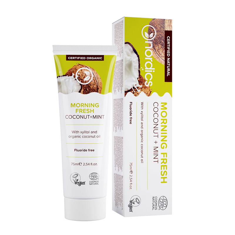 Naturalna pasta do zębów Nordics Morning Fresh z olejem kokosowym i miętą. Idealna do porannej rutyny. Kompleksowa pielęgnacja do codziennego użytku o właściwościach przeciwpróchniczych.