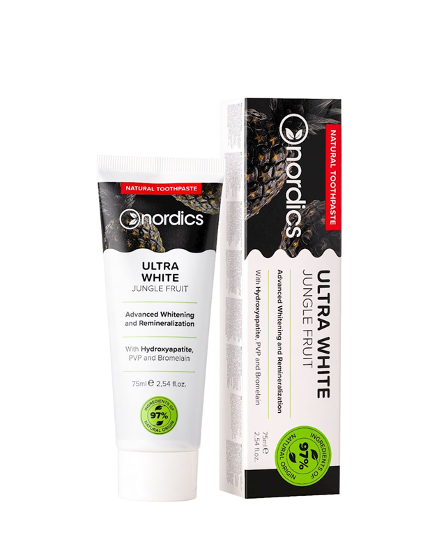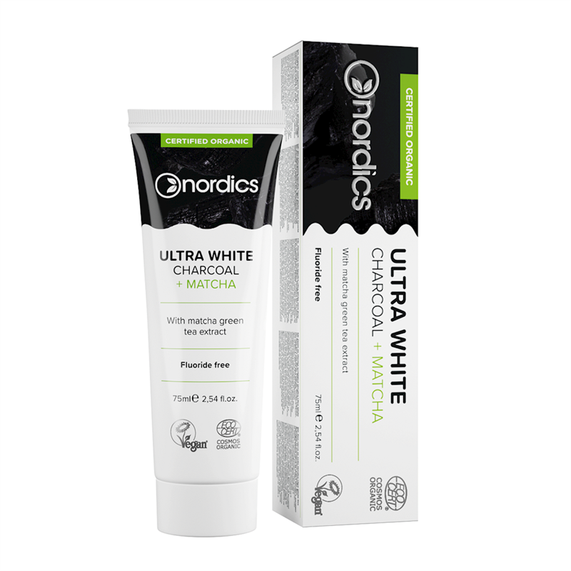 Pasta do zębów Nordics Ultra White zawiera węgiel aktywny i organiczny ekstrakt z zielonej herbaty matcha. Ma głęboką czerń i ładną gęstą strukturę. Aromat jest mocny z nutą zielonej herbaty i pozostaje z Tobą długo po zakończeniu szczotkowania.