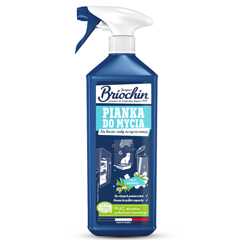 Pianka do mycia Briochin to uniwersalny środek czyszczący, który sprawdzi się w całym domu. Jest niezastąpiona w kuchni – pomaga usunąć resztki jedzenia, tłuste plamy i uporczywe zabrudzenia z blatów, kuchenek, mikrofalówek, desek do krojenia czy wnętrza lodówek. Jest bezpieczna dla powierzchni mających kontakt z żywnością, dzięki czemu można jej używać bez obaw w miejscach, gdzie przechowywane są produkty spożywcze.