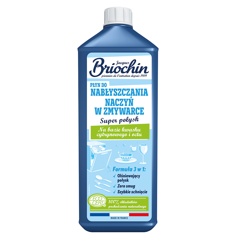 Płyn do nabłyszczania naczyń w zmywarce Briochin to skuteczny preparat 3w1, który zapewnia naczyniom wysoki połysk, przyspiesza ich schnięcie i eliminuje smugi. Jego formuła została opracowana na bazie kwasku cytrynowego i octu, dzięki czemu skutecznie usuwa osady mineralne i zapobiega powstawaniu zacieków, czerpiąc moc z natury.