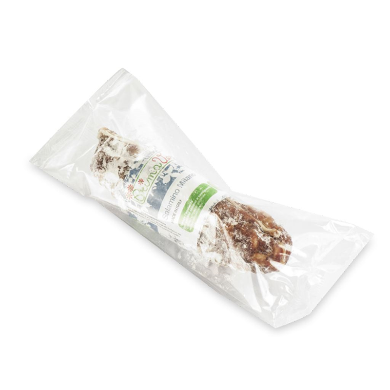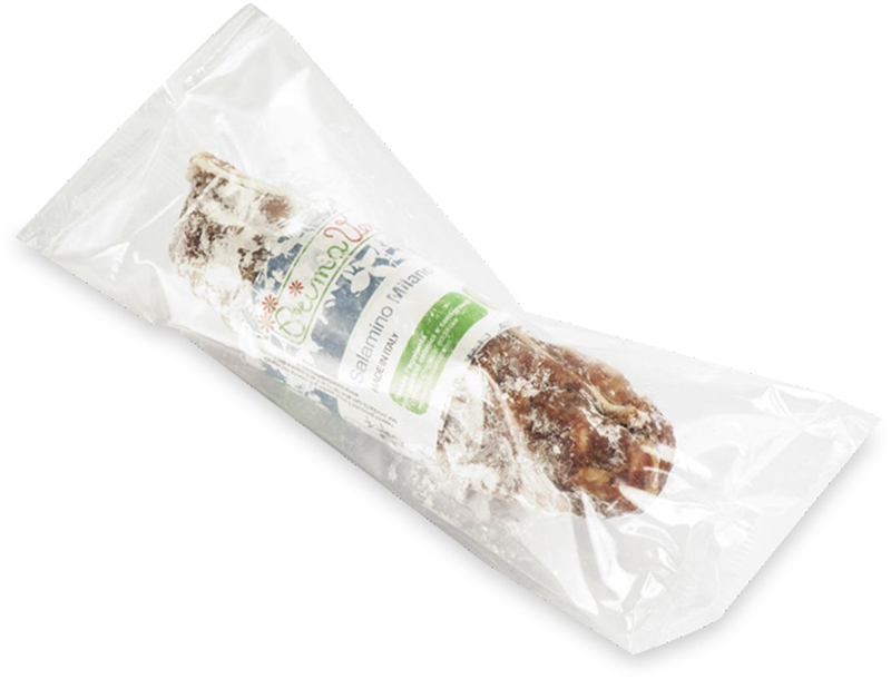 Ekologiczne małe salami o słodkim smaku. Nie zawiera glutenu. Bez ubocznych produktów mlecznych. 100% wieprzowiny pochodzące z włoskich gospodarstw hodowlanych.