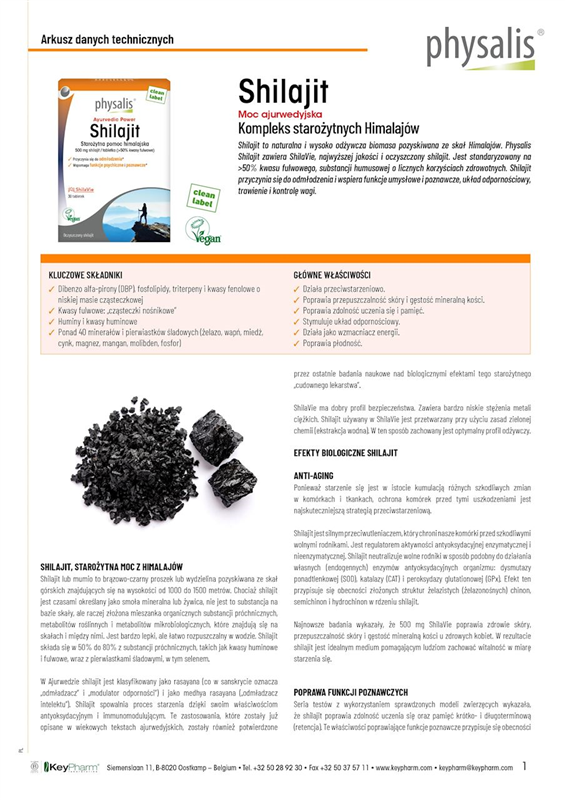 Shilajit to naturalna i wysokoodżywcza biomasa pozyskiwana ze skał Himalajów. Physalis Shilajit zawiera PrimaVie™ Shilajit, opatentowany, zbadany i oczyszczony shilajit. Standaryzowany jest na zawartość 65 % kwasu fulwowego, substancji humusowej o licznych właściwościach zdrowotnych. Shilajit przyczynia się do odmłodzenia i wspiera funkcje umysłowe i poznawcze, układ odpornościowy, trawienie i kontrolę wagi.
