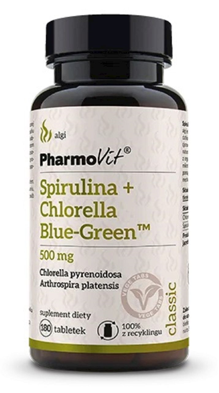 SPIRULINA + CHLORELLA BLUE-GREEN (500 mg) BEZGLUTENOWA 180 TABLETEK - PHARMOVIT (CLASSIC)