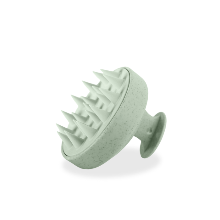 Ergonomiczny uchwyt z dodatkiem słomy pszenicznej został zaprojektowany tak, aby szczotka nie wypadała z rąk podczas mycia. Miękkie silikonowe wypustki pobudzają krążenie i pomagają w usunięciu martwego naskórka ze skóry głowy. Subtelny pastelowy kolor szczotki wprowadza do wnętrza równowagę i dobre samopoczucie.