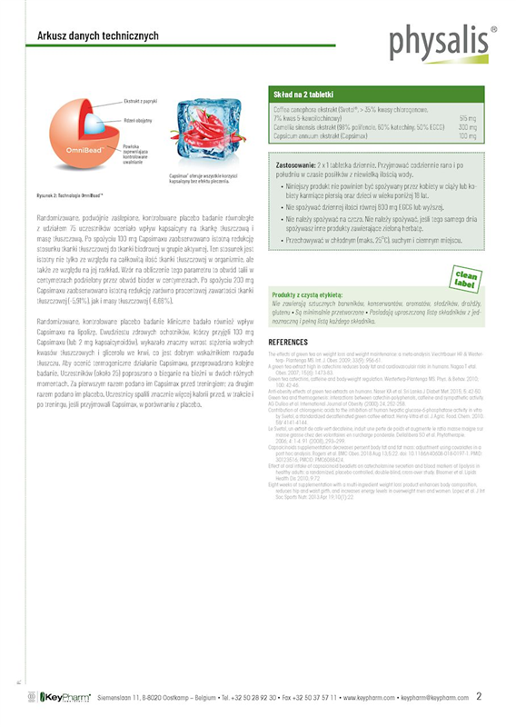 Physalis Fat burner to kompleks na bazie zielonej herbaty, który przyczynia się do lepszego zarządzania masą ciała. Zawiera również ekstrakt z zielonych ziaren kawy (Svetol®), zawierający co najmniej 35 % kwasów chlorogenowych i 7 % kwasu 5-kawoilochinowego. Svetol® ma unikalny skład (typowy stosunek kwasu 5-kawoilochinowego/kwasów chlorogenowych: 0,2-0,3), którego skuteczność została wykazana w licznych badaniach. Na koniec, ten kompleks zawiera skoncentrowany i wysoce aktywny naturalny ekstrakt z czerwonej papryczki chilli: Capsimax. Dzięki swojej enkapsulacji i technologii kontrolowanego uwalniania, ten ekstrakt jest w stanie stopniowo uwalniać składnik aktywny kapsaicynę na poziomach, które nie powodują obciążenia ani dyskomfortu dla żołądka. Papryczka chilli wspomaga proces termogenezy (produkcji ciepła) w organizmie, a tym samym promuje prawidłowe funkcjonowanie metabolizmu tłuszczów.