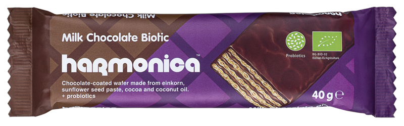 WAFELEK Z KREMEM MLECZNO - KAKAOWYM W POLEWIE Z MLECZNEJ CZEKOLADY Z PROBIOTYKAMI BIO 40 g - HARMONICA