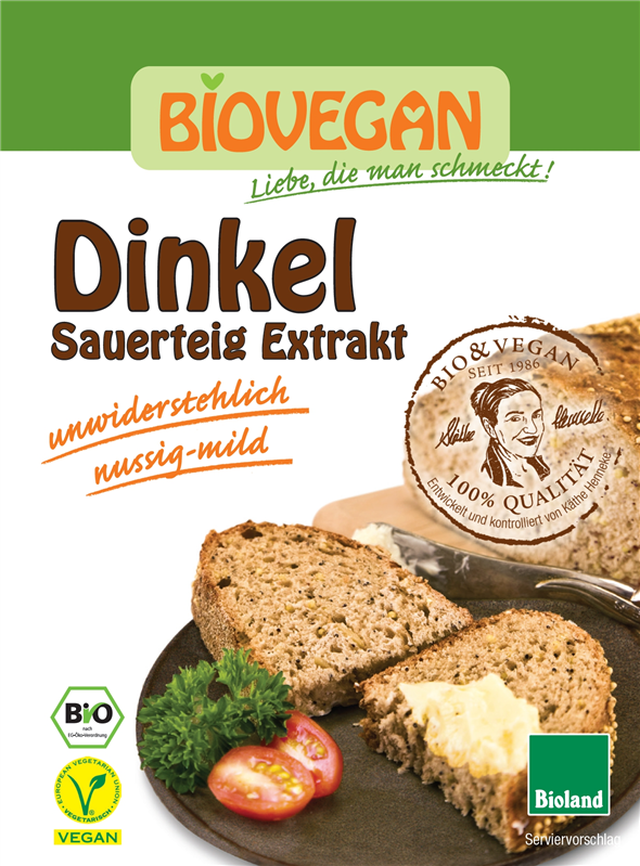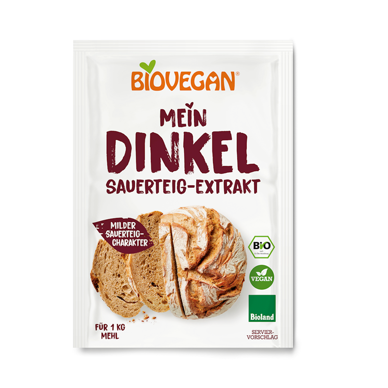 Składniki: 1 saszetka zakwasu chlebowego orkiszowego bio 30 g Biovegan, 700 g mąki orkiszowej, 300 g mąki żytniej, 2 saszetki drożdży suszonych bezglutenowych bio 9 g Biovegan, 2 łyżeczki soli, 750 ml letniej wody.