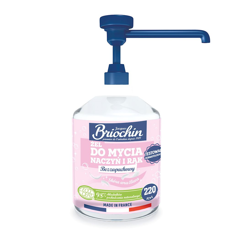 Żel do mycia naczyń i rąk Briochin o formule dedykowanej skórze wrażliwej to naturalny, bezzapachowy środek czyszczący 2w1. Produkt nie zawiera barwników, zapachów ani konserwantów co czyni go bezpiecznym rozwiązaniem dla alergików i osób o wrażliwej skórze. Formuła oparta na tradycyjnym francuskim mydle marsylskim skutecznie odtłuszcza, a jednocześnie nie podrażnia skóry rąk, zapewniając jej delikatność i komfort. Może być także używany do mycia butelek dla niemowląt.