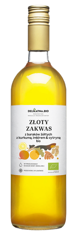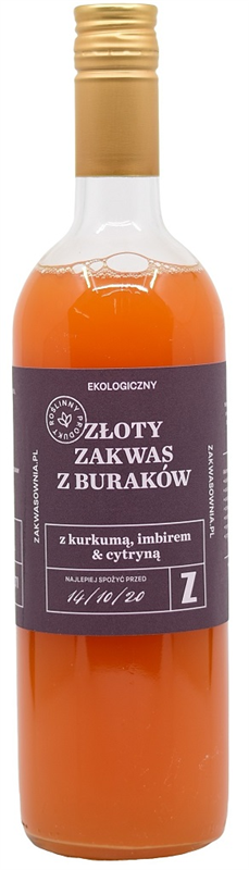 ZŁOTY ZAKWAS Z BURAKÓW Z KURKUMĄ, IMBIREM I CYTRYNĄ BEZGLUTENOWY BIO 700 ml - ZAKWASOWNIA